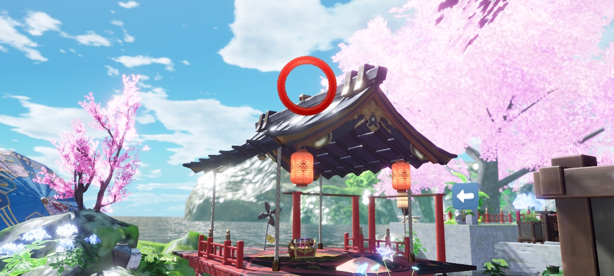 本篇为大家分享开放空间中樱花长廊的隐藏宝箱的位置,这个宝箱很容易被忽略,因为是在平台的屋顶上。