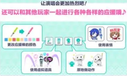 虚拟演唱会期间出场角色间会进行对话并演唱歌曲,各位居民可以通过点击屏幕来改变荧光棒颜色并挥动荧光棒,通过滑动或倾鈄设备来自由移动视角。