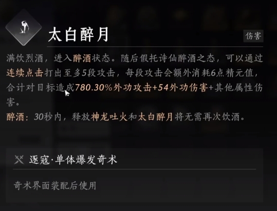满饮烈酒,进入醉酒状态。随后假托诗仙醉酒之态,可以通过连续点击打出至多5段攻击,每段攻击会额外消耗6点精元值,合计对目标造成780.30%外功攻击+54外功伤害+其他属性伤害。