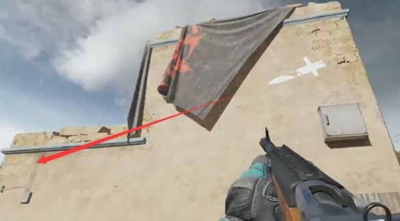 在荒废村庄的矮墙上看到刀的箭头看旁边的蓝墙是数字7。