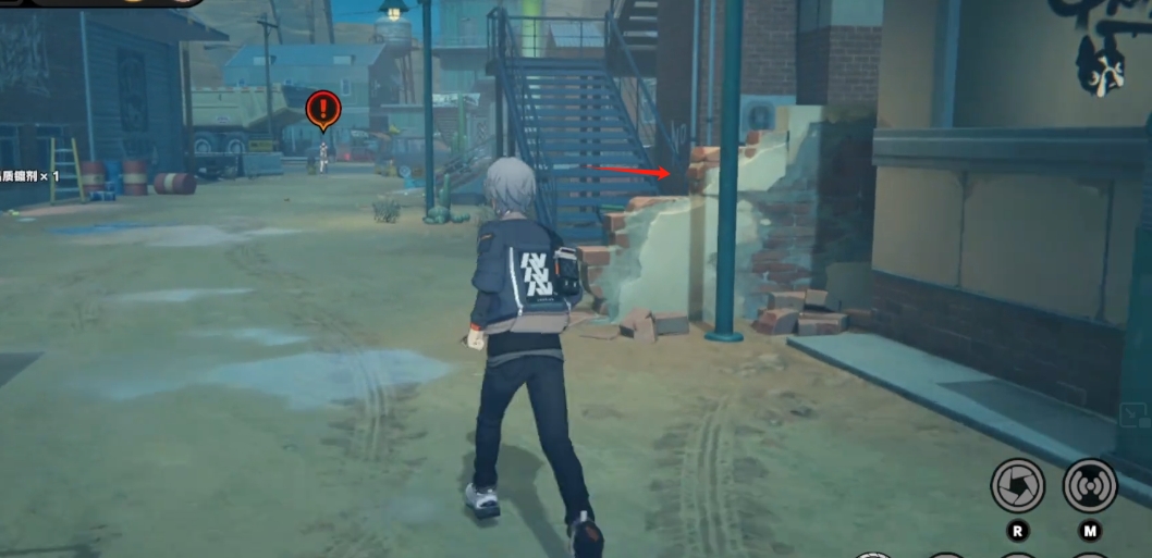 2、往前走进入野火镇,来到右侧有楼梯的位置,顺着箭头的方向进入巷子。
