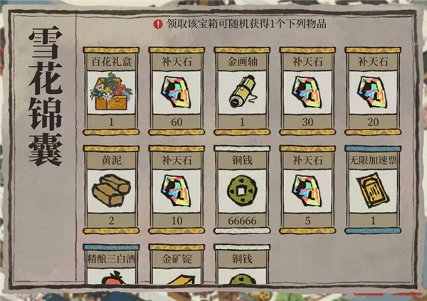 有补天石、金画轴、三白酒、百花礼盒、无限加速票等道具。