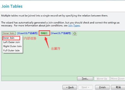 4、在此对话框中,选择BarTender数据库连接类型——内部连接,选择运算符“相等于”。此设置将实现连接EXCEL的多个工作表。本例中是两个工作表,如需连接更多工作表,可单击按钮进行添加。单击完成即可。