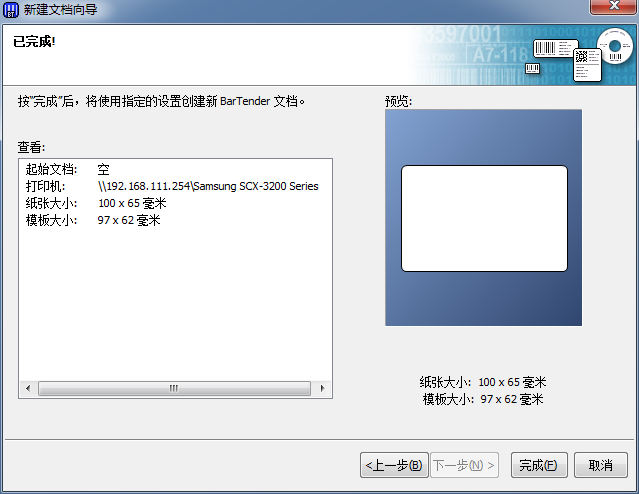 确认新建标签的信息,单击完成,BarTender创建新标签就完成了,你可以开始设计制作条码标签了。