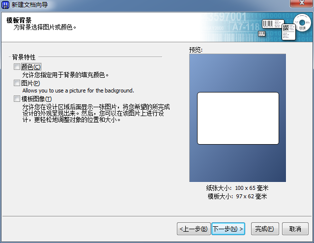 这也是BarTender 10.1比较创新的一个地方,允许指定用于背景的填充颜色或图像,单击下一步;
