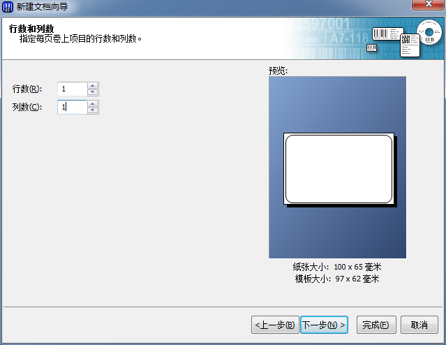 指定每页标签的行数和列数。若是一页上只有一个项目,则分别输入1,单击下一步;